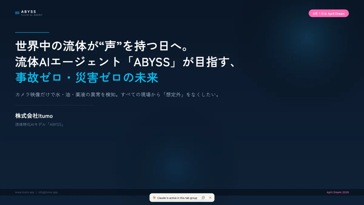 株式会社Itumoが開発した流体AIエージェント「ABYSS」は、事故や災害のゼロを目指すプロジェクトです。流体が自ら異変を伝える技術で、現場の監視体制を革新します。本記事では、この画期的な技術とその未来像について詳しく探ります。