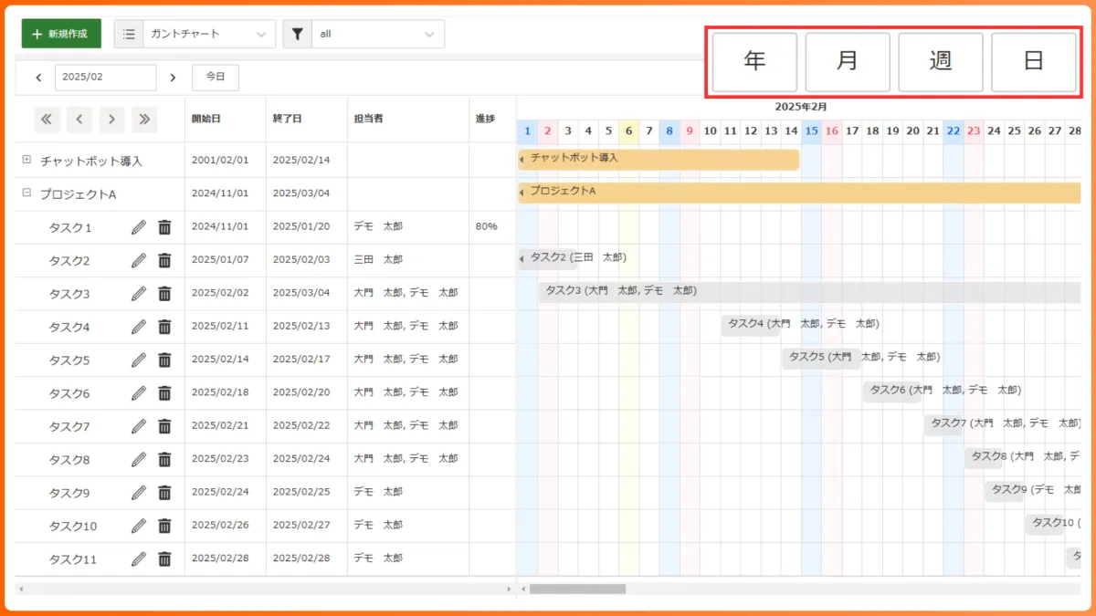 新たに追加されたガントチャートビューでは、プロジェクトとタスクを同時に表示でき、進捗状況を一目で把握することが可能になります。年、月、日単位での表示切替もでき、プロジェクト管理がさらにスムーズになります。