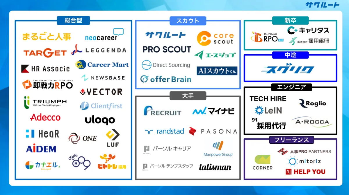 カオスマップには、採用代行を行っている企業やサービスを「総合型」「スカウト」「新卒」「中途」「大手」「エンジニア」「フリーランス」という7つのカテゴリに分けて一望できるように整理されています。これにより、企業は自身のニーズに合ったサービスを簡単に見つけやすくなります。