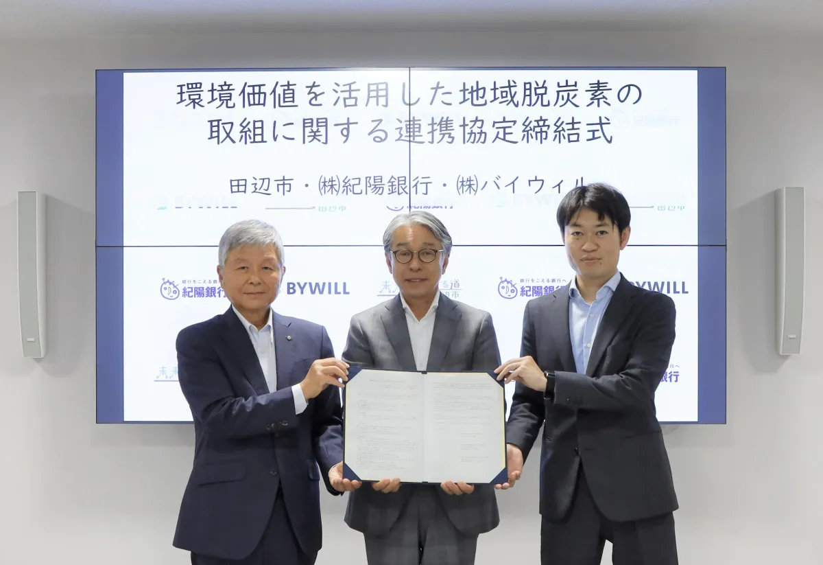 このように、紀陽銀行とバイウィル、田辺市は、それぞれの役割を果たしつつ、脱炭素社会の実現に向けた協働を進めます。