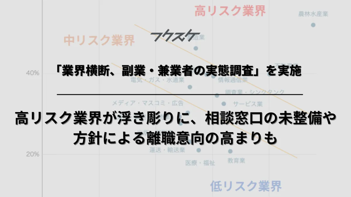 近年、副業・兼業の促進が政府主導で進められていますが、実際にどのような問題が業界で起こっているのかは依然として不透明です。そんな中、株式会社フクスケが行った「業界横断 副業・兼業者の実態調査」によって、様々な業界の副業の現状、リスク、課題が明らかになりました。