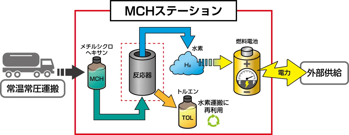 MCHステーションは、水素を有機ハイドライド技術を利用して安全に輸送し、安定した電源供給を行うための装置です。水素は、軽量で拡散しやすいため、取り扱いには細心の注意が必要ですが、MCHステーションはその特性を克服する技術を用いています。具体的には、気体の水素を液体有機水素キャリア(LOHC)であるMCHに変換し、必要なときには水素を分離して電力として供給します。