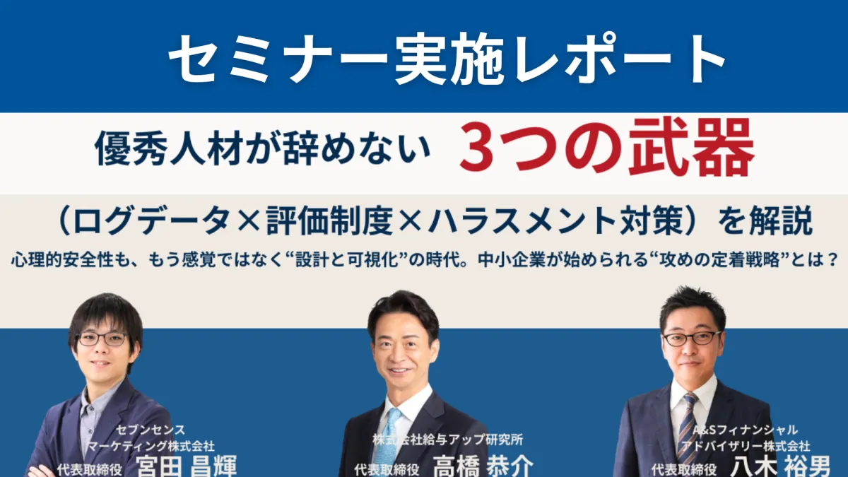 2025年5月14日、オンラインで開催されたセミナーには、株式会社給与アップ研究所、セブンセンスマーケティング、A&Sの三社が共催。テーマは「見える組織が人を惹きつける!!優秀人材が辞めない3つの武器」で、40名以上の中小企業経営者や人事責任者が参加しました。