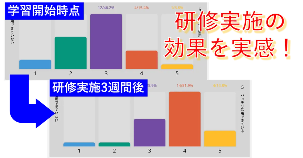 研修の成果はアンケートを通じて評価されました。研修前、1週間後、3週間後の段階で受講者の理解度と活用度を測定し、結果を明らかにしました。特に理解度は平均スコアが2.8から4.03と大幅に上昇し、活用度も同様に向上しました。