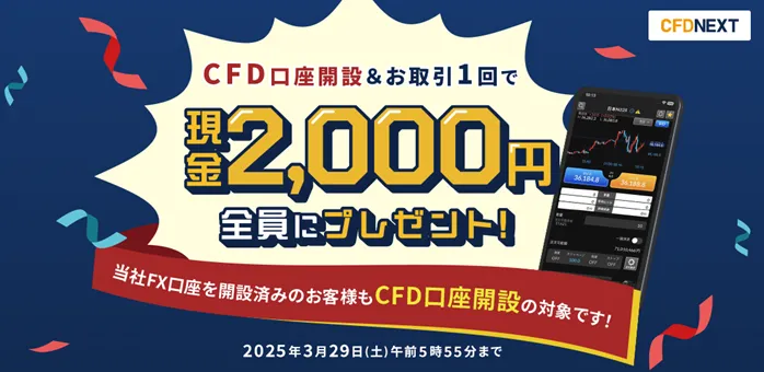 株式会社外為どっとコム(本社:東京都港区、代表取締役社長:竹内淳)は、2025年2月24日(月)より「CFD口座開設&お取引1回でもれなく現金2,000円をプレゼント!キャンペーン」を開始します。このキャンペーンは、CFDネクスト口座を新たに開設し、1回お取引を行うことで現金がもらえるという非常に魅力的な内容です。