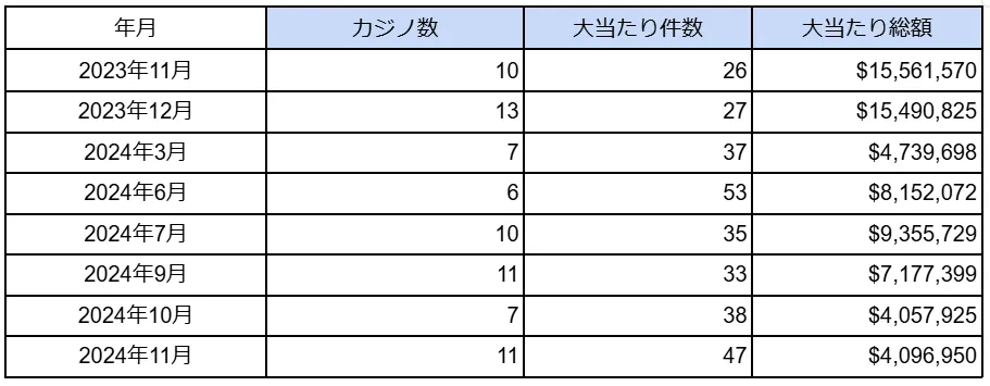 2024年11月の調査によると、海外カジノで発生した大当たりの総額は約4,096,950ドル(日本円で約6.4億円)だったことがわかりました。この大当たりは、対象となる11カジノでの47件にわたっており、いずれも$10,000以上の大当たりが計上されています。これらのデータは、カジノにおけるプレイヤーの期待感や、運営側の売上に大きな影響を与える要素となっています。