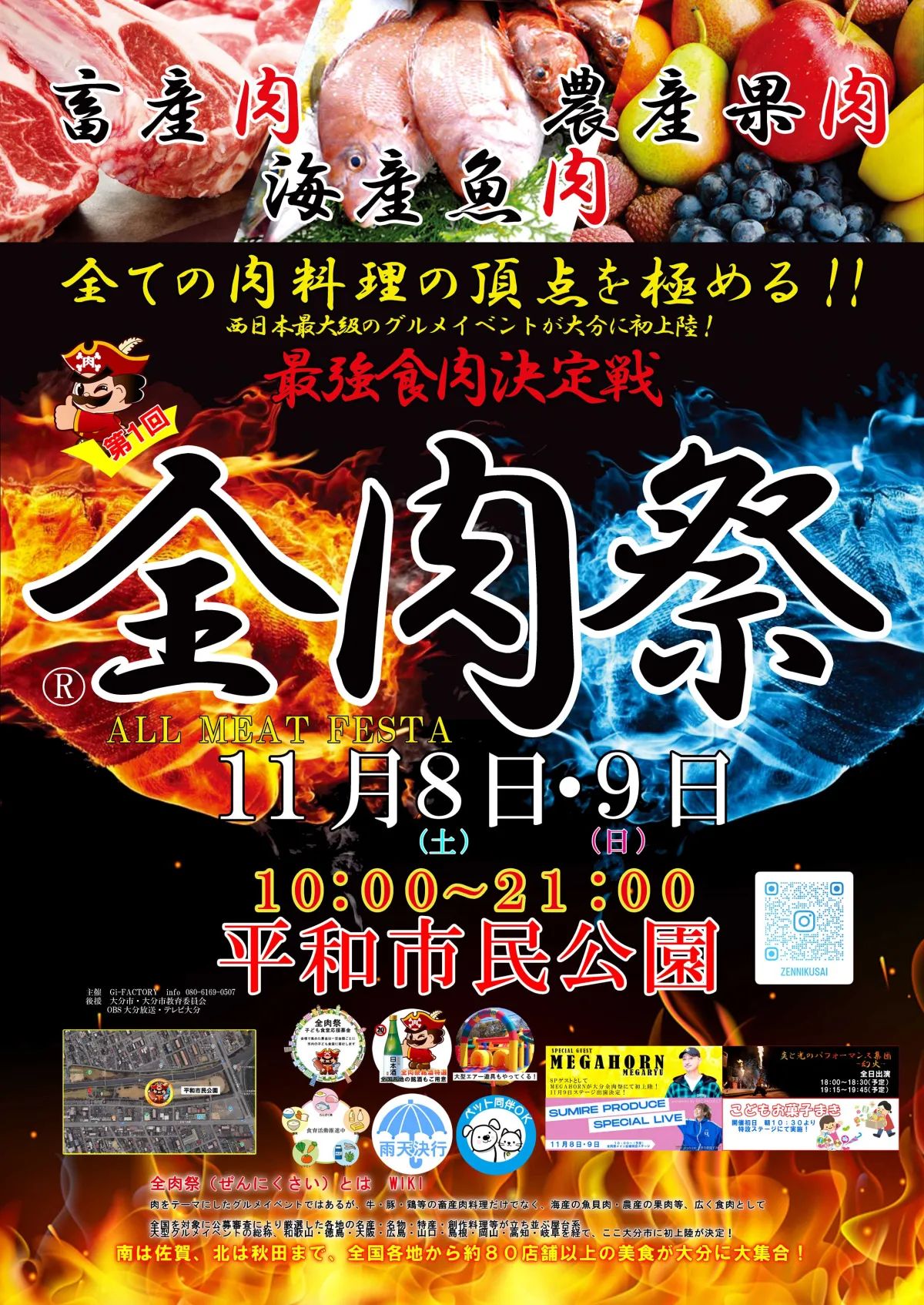 肉料理ファン必見のイベント「全肉祭」が、2025年11月8日(土)と9日(日)の2日間、大分県大分市の平和市民公園にて初開催されることが決定しました。このイベントは、全国各地から肉料理に特化したグルメが一堂に集まるもので、肉好きにはたまらない内容になっています。