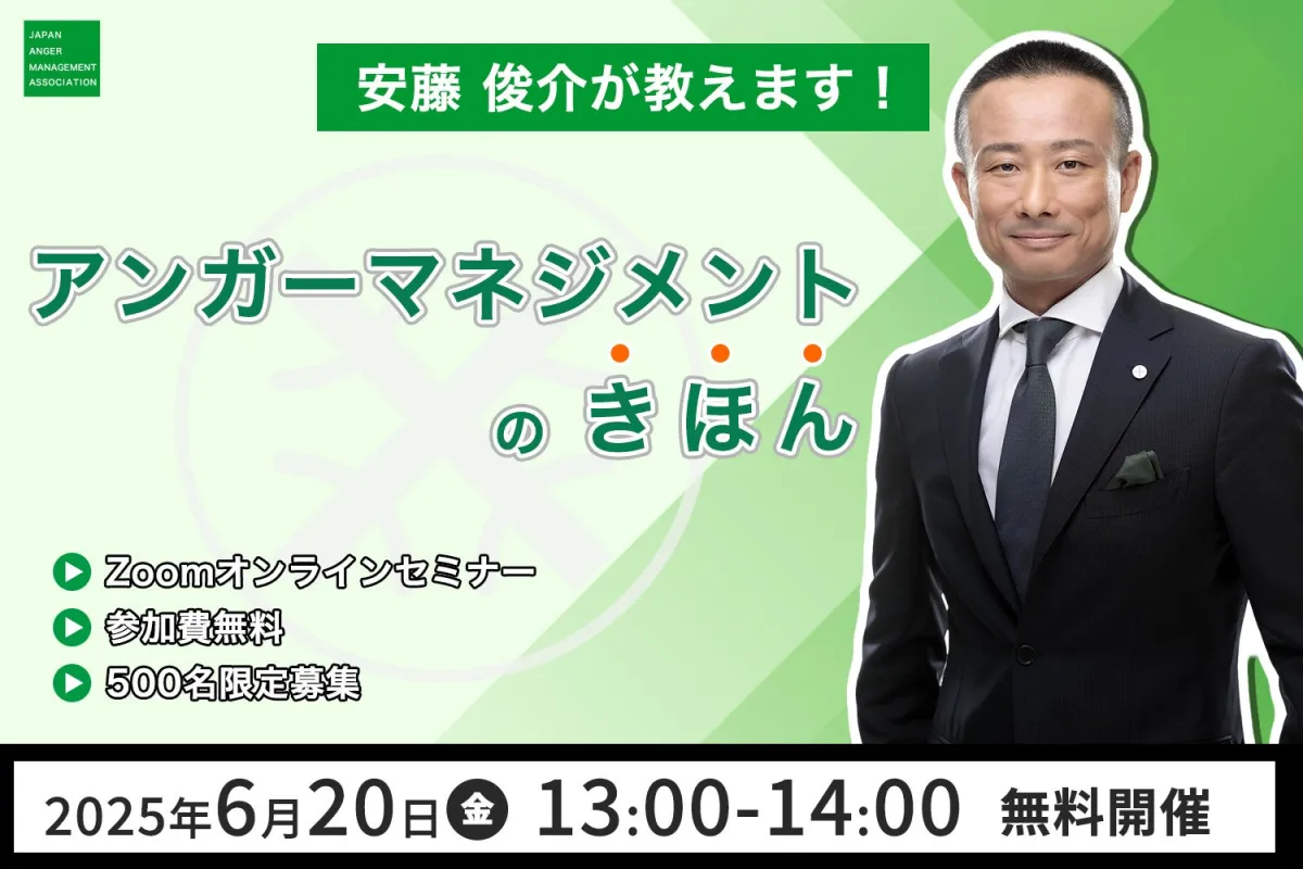 2025年の6月20日金曜日、午後1時から日本のアンガーマネジメントの権威である安藤俊介氏が主催する無料オンラインセミナー「アンガーマネジメントの基本」が開催されます。このセミナーは、一般社団法人日本アンガーマネジメント協会が運営し、誰でも申し込める形式となっています。セミナーはZoomを通じて配信され、定員は500名で、参加は無料です。