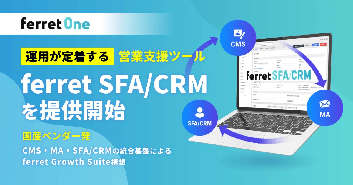 『ferret Growth Suite』は、CMS・MA・SFA/CRMを一枚岩で統合した仕組みを提供する、国産ベンダーの中で稀有な存在です。このスイートは、営業チームが専門知識なしでも安定的に運用できる環境をサポートし、業務の分断を防ぎます。