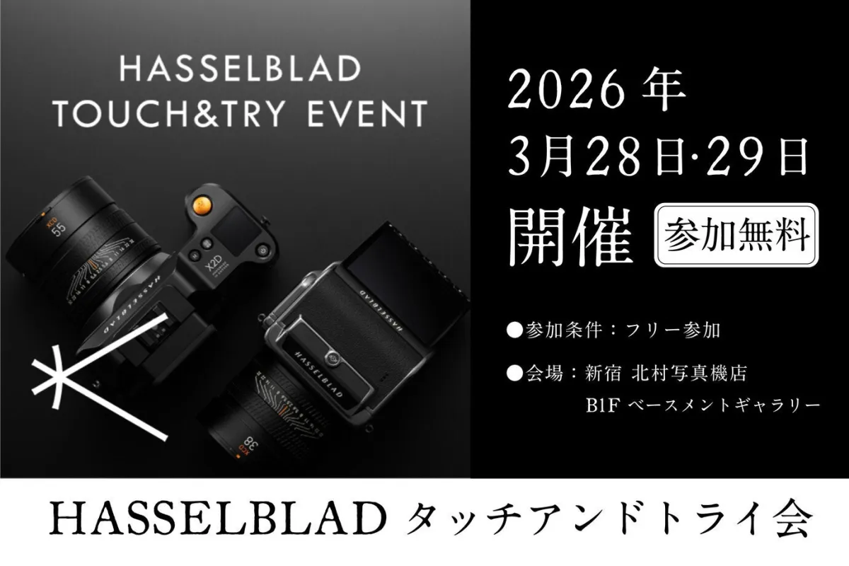 新宿 北村写真機店が主催する「ハッセルブラッド タッチアンドトライ会」が、2026年3月28日(土)と29日(日)の2日間、同店の地下1階にあるベースメントギャラリーで行われます。このイベントでは、プロの間でも高い人気を誇るハッセルブラッドのカメラを実際に手に取って体験することができます。