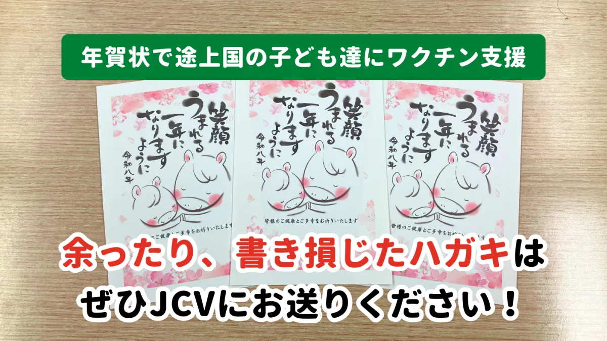 「認定NPO法人 世界の子どもにワクチンを 日本委員会」(以下JCV)は、未使用の年賀状や書き損じのハガキを他のハガキや未使用・使用済み切手と一緒に回収し、途上国における子どもたちへのワクチン支援に活用しています。また、年末に出る不要品も、楽しくエコな方法で支援につながります。