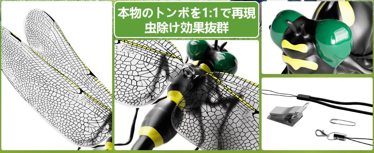 「虫除けトンボ君」は、トンボの天敵効果を模した商品です。様々な小型昆虫、例えば蚊やアブ、ハエなどを効果的に寄せ付けず、レジャーやキャンプ、バーベキューなどのシーンで大変重宝します。デザインはマウンテンゴーストトンボに近いリアルな仕上がりで、これがまた話題を呼んでいます。