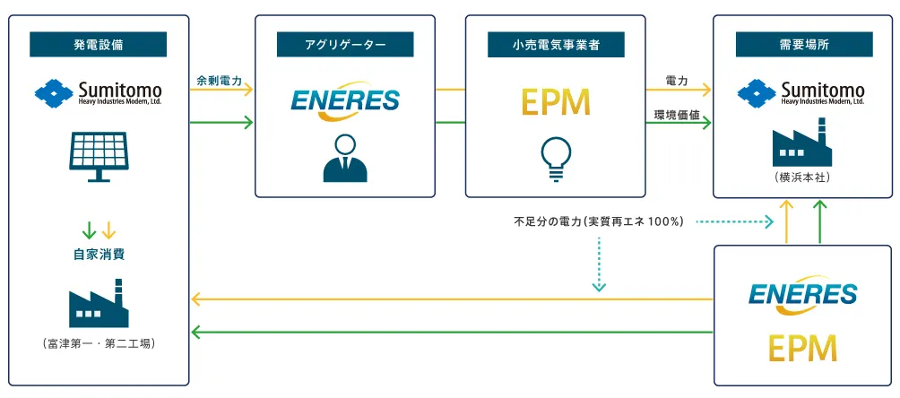 住友重機械モダンは、環境への配慮を強化する中で、自社工場に再エネ発電設備を導入してきました。2024年10月からは、エナリスやEPMからの実質的な再エネ電力供給により、実質再エネ100%の運用を実現しました。この新しいスキームでは、富津にある工場で発生する余剰電力を横浜本社工場で利用することにより、再エネ利用率の向上が期待されます。