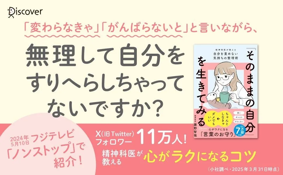 2025年4月18日、株式会社ディスカヴァー・トゥエンティワンより、『「そのままの自分」を生きてみる 精神科医が教える自分を責めない気持ちの整理術』(藤野智哉著)が特装版として発売されます。本書は、すでに2024年に刊行された著書『「そのままの自分」を生きてみる 精神科医が教える心がラクになるコツ』の限定カバー版で、内容は同じですが特別なカバーデザインが施されています。
