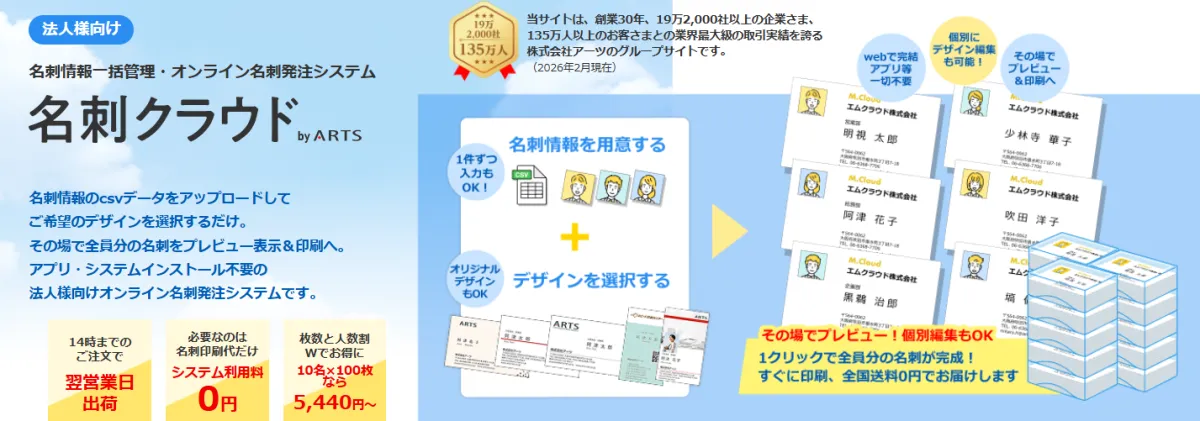 株式会社アーツが新たに提供を開始したオンライン名刺発注サービス「名刺クラウド by ARTS」。このサービスは、法人向けに特化した名刺の発注業務を大幅に効率化します。特に、複数名の社員の名刺をCSVファイルで一括登録し、希望のデザインを選ぶだけで、全員分の名刺を簡単に作成できます。