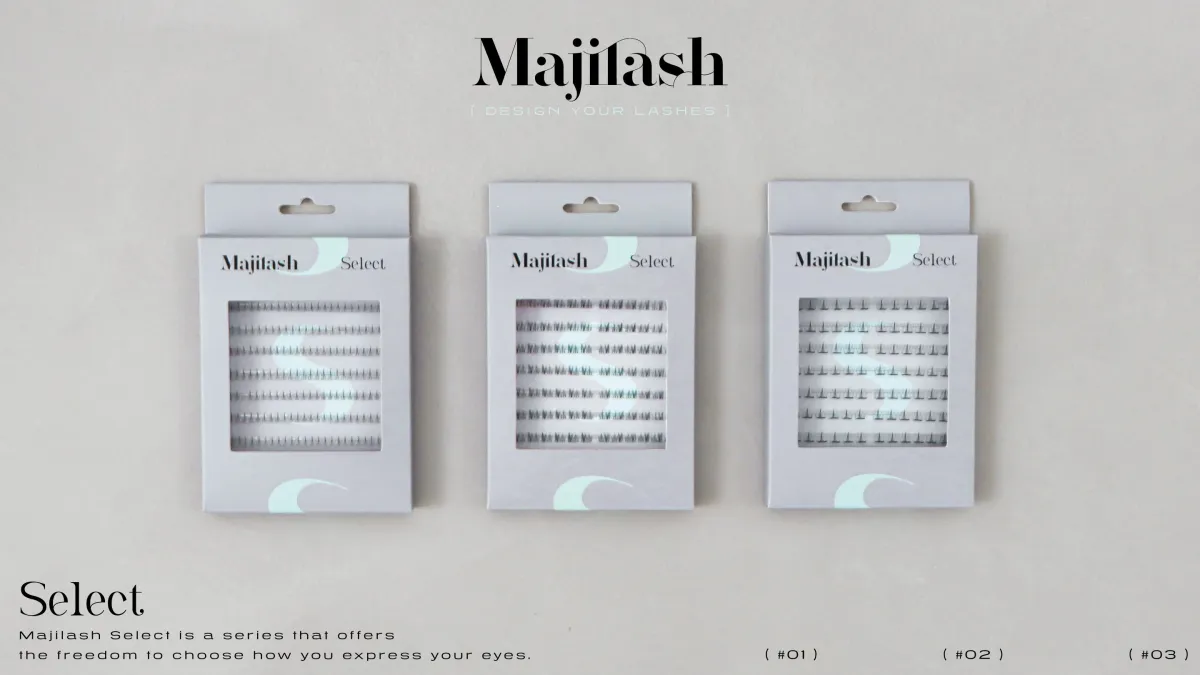 「Majilash Select」は、目元の印象を自由にデザインするためのプレミアムラインです。短めの設計や自然な肌なじみを持つクリアグルーを利用し、自然な美しさを引き立てる多様なデザインを展開しています。このシリーズは、単なる「つけまつげ」ではなく、目元をデザインする楽しさを提案する新しい商品群です。