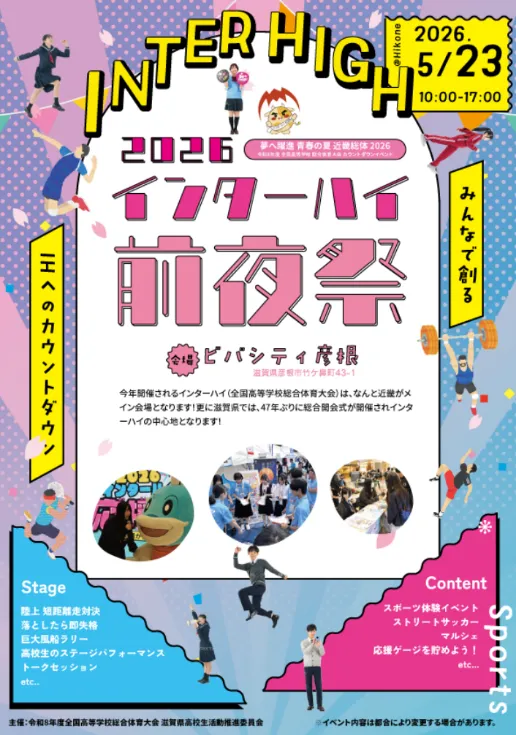 2026年5月23日(土)、滋賀県彦根にあるビバシティ彦根で「インターハイ前夜祭」が開催されることが決定しました。このイベントは、今夏に行われる全国高等学校総合体育大会(インターハイ)の開催を控えた重要な前夕祭となります。主催となるのは、滋賀県高校生活動推進委員会で、地域の高校生たちが主体となり企画し、運営することが特徴です。