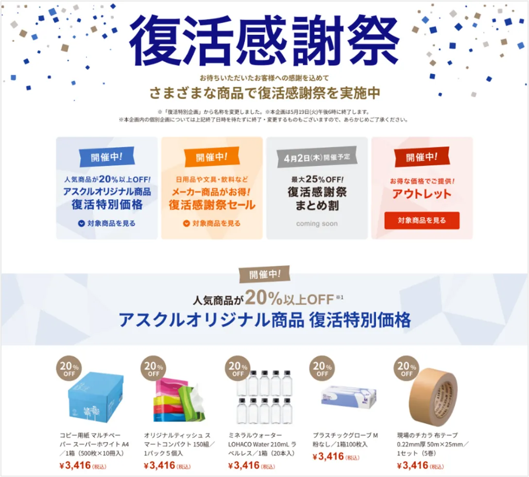 アスクル株式会社は、2026年2月24日18時より、事業所向け通販サービス「ASKUL」と「ソロエルアリーナ」で「復活感謝祭」を開催します。この特別企画では、システム障害のお詫びとして、事業所向けの日用品をお得な価格で提供します。今回の企画は、ウェブサイトを通じて簡単に購入できる多彩な商品ラインナップを特徴としています。