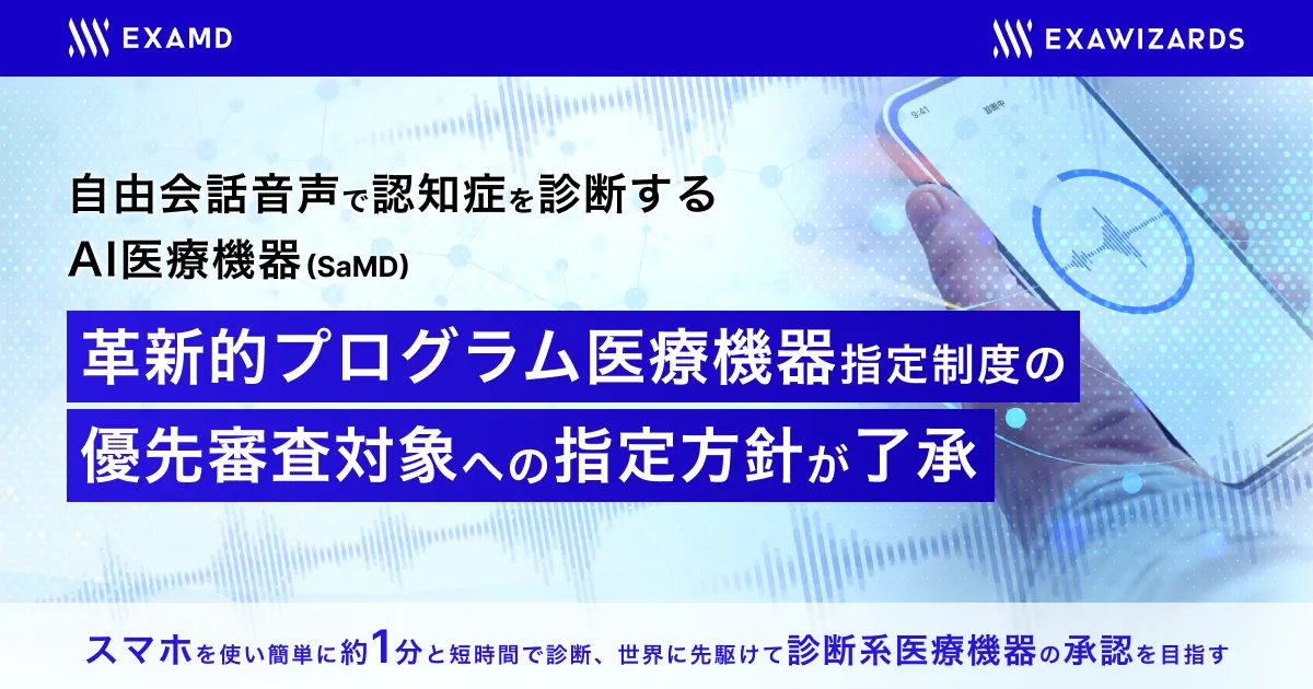株式会社エクサウィザーズ(東京都港区、代表取締役社長:春田 真)は、その100%子会社である株式会社ExaMD(東京都港区、代表取締役:羽間 康至)が開発中の革命的なAI医療機器についてお知らせします。この製品は、自由な会話を通じて認知症を診断する仕組みを持っています。そして、最近厚生労働省よりプログラム医療機器(SaMD)として優先審査の対象品目に承認される方針が決まりました。