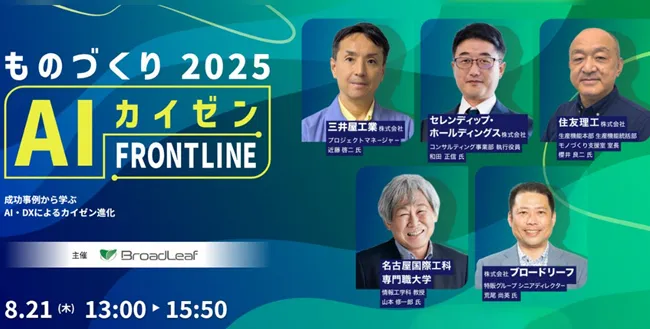 2025年8月21日、セレンディップ・ホールディングス株式会社が主催するオンラインイベント「ものづくりAIカイゼンFRONTLINE 2025」に登壇します。このイベントは、製造業が直面する様々な課題に対し、AIとデジタルトランスフォーメーション(DX)によってどのように解決していくかを探求する機会です。