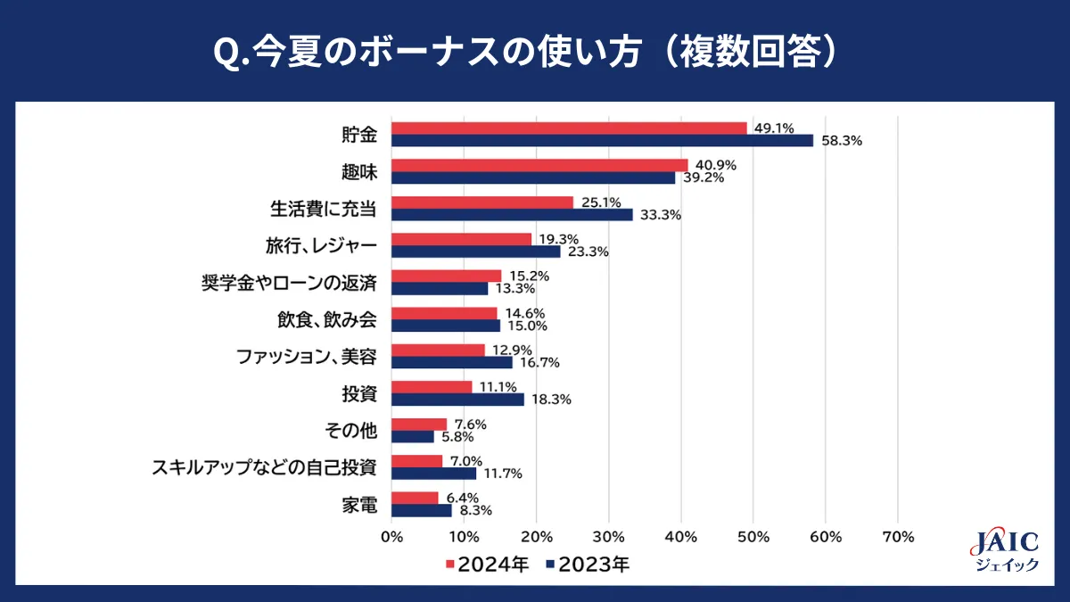 興味深いのは、ボーナスの支給額が増えた場合、生活費に充当したいと回答した人が減少し、投資や自己投資、ファッション・美容に充てたいという回答が増加したことです。これは、余裕資金が増えれば、より将来を見据えた計画的な支出を検討する人が増える傾向にあることを示唆しています。
