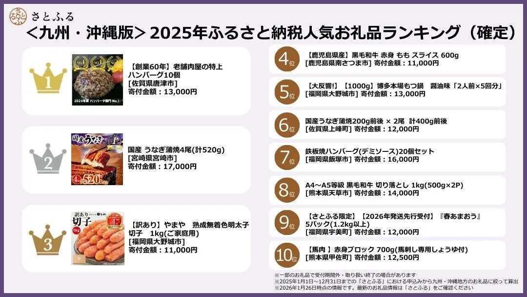 ふるさと納税ポータルサイト「さとふる」を運営する株式会社さとふるは、2025年の九州・沖縄版人気お礼品ランキングを発表しました。特に注目すべきは、訳ありの「明太子」や大容量の「もつ鍋」など日常に役立つ品々がランクインする中、特別感を楽しむ大人気の「国産うなぎ蒲焼」や「黒毛和牛」、さらに季節感を意識した「春あまおう」なども順位を上げています。