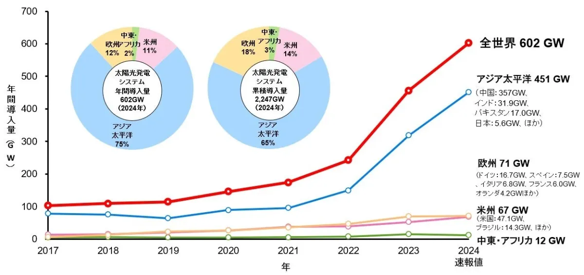 2024年の予測によれば、世界全体での太陽光発電システムの年間導入量は602 GWに達し、累積導入量も2 TWを突破する見込みです。この成長は、脱炭素社会の実現を目指した政策の推進や、PPA(Power Purchase Agreement)や入札制度の拡大、発電コストの低下が要因になっています。また、太陽電池の年間生産量も750 GWを超えると予測され、業界は大きな転換点を迎えています。