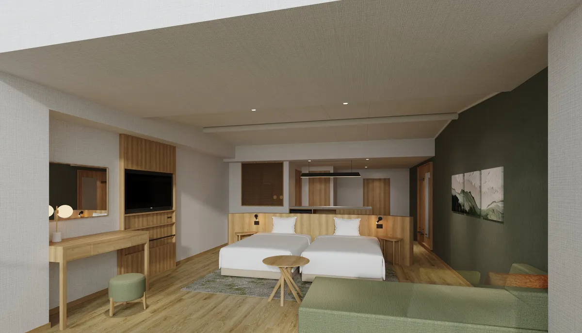 この客室は、地元の自然と一体化したデザインが特徴です。大きな窓からは、眼下に流れる清らかな渓流や、周囲の里山の美しいマウンテンビューを楽しむことができます。ここでは、日常の喧騒を忘れ、ただ静寂に浸る贅沢な時間を味わうことができます。また、デザインにもこだわり、優しいサンドグレージュと無垢材が織り成す上質なインテリアが施されています。心地よい空間での滞在をサポートするため、デスクや大画面テレビも完備されています。