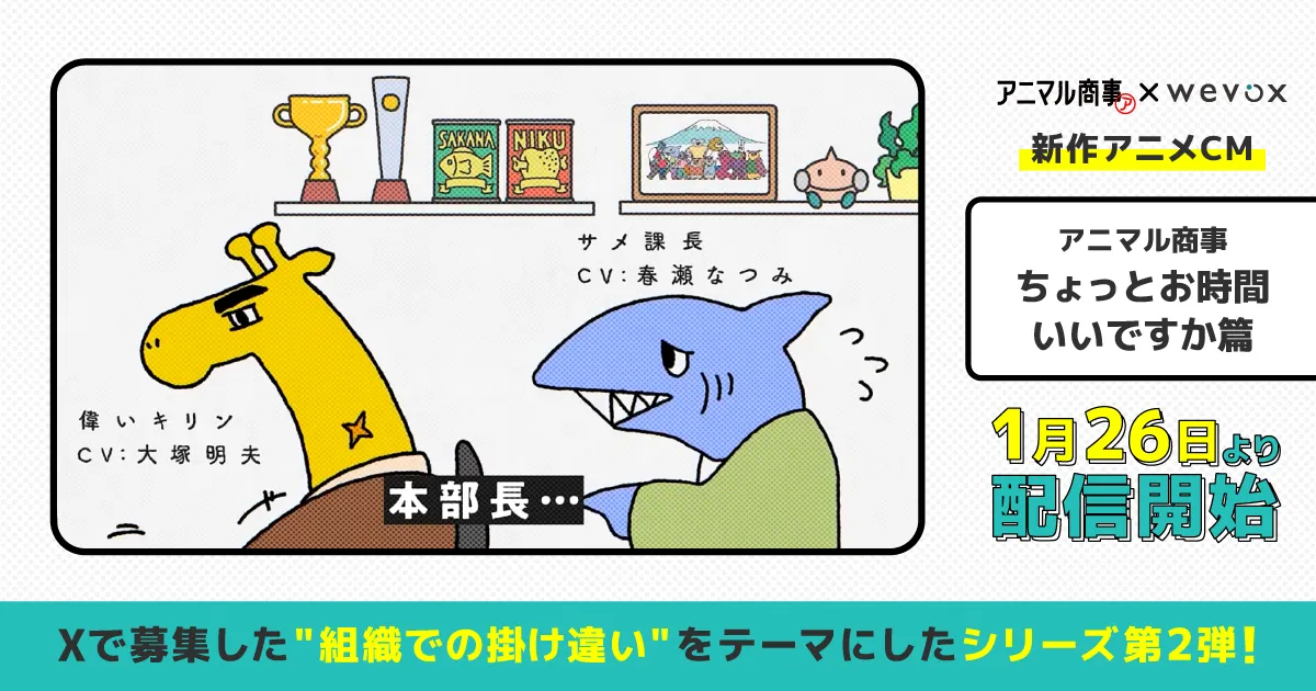 株式会社アトラエが展開する「Wevox」とは、エンゲージメントを基盤にした組織力向上を目指すプラットフォームです。そして、このWevoxの魅力を伝えるための新作アニメCM「アニマル商事〜ちょっとお時間いいですか篇〜」が、2026年1月26日より配信開始されます。