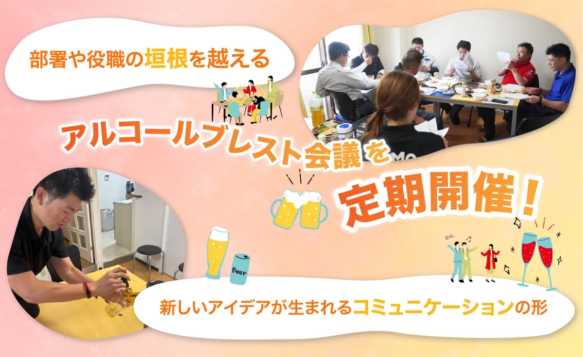 ビジネスの現場では、通常の会議形式では社員が肩書きや立場を意識しすぎて、自由な意見を出すのが難しいことがあります。しかし、社内のコミュニケーションを深めるためには、リラックスした雰囲気での意見交換が不可欠です。そこで、「アルコールブレスト会議」を通じて、社員が気軽に本音で話し合える機会を提供しています。