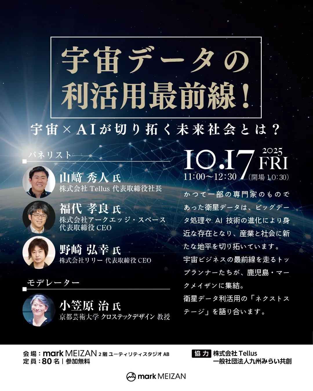 2025年10月17日(金)、鹿児島市にあるマークメイザンで、人工衛星データとAIをテーマにしたトークイベントが開催されます。主催は鹿児島市に位置するマークメイザンで、一般社団法人九州みらい共創が協力を行います。このイベントでは、宇宙ビジネスやデータ活用の最前線に立つ4名のスピーカーが、最先端の技術を使った新しいビジネスの可能性について語ります。