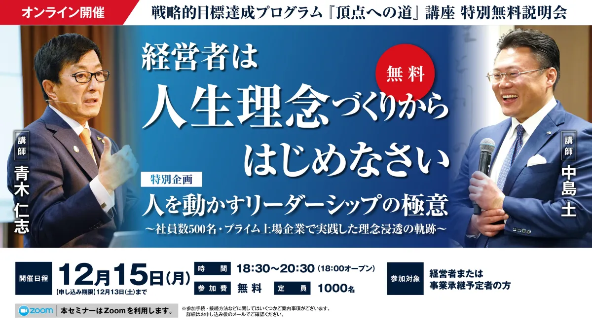 この特別講演会では、理念経営を実現するための具体的な方法や、組織を繁栄させるための考え方を学ぶことができます。中島社長の経験に基づいた講演は、参加者にとって有益な情報が豊富に盛り込まれています。