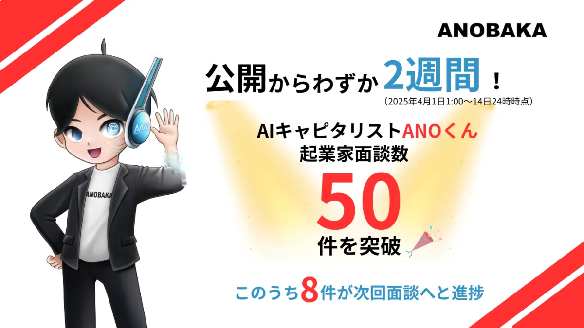 株式会社ANOBAKAが開発したAIキャピタリスト「ANOくん」が、リリースからわずか2週間で面談件数が50件を超える快挙を達成しました。この「ANOくん」は、国内ベンチャーキャピタル業界初となるAIを活用した投資検討ツールで、起業家たちからの高い関心を集めています。