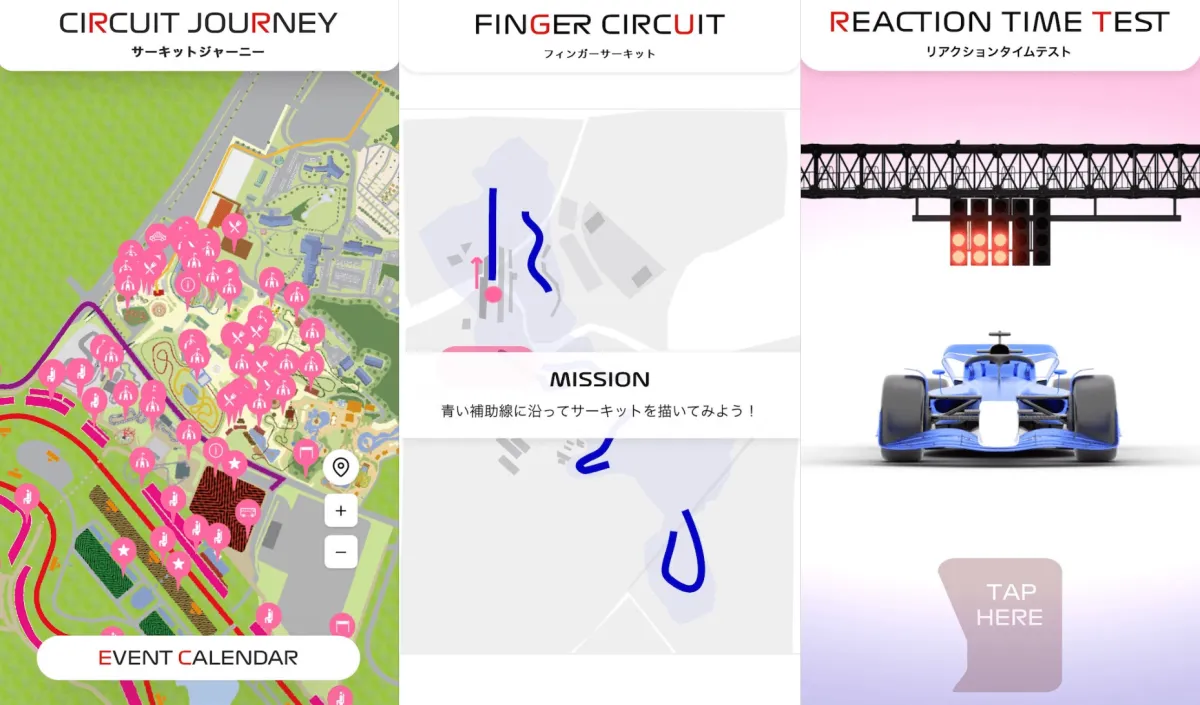 次に、「FINGER CIRCUIT」というゲーム機能です。このゲームは、鈴鹿サーキットのコースを思い出して指でトレースするというものです。コースの一部分のみが表示され、補助線を頼りにスタートからゴールまでコースを描く必要があります。2段階の難易度が設けられているため、幅広いファン層が楽しむことができ、友達と競い合うことで交流も生まれます。
