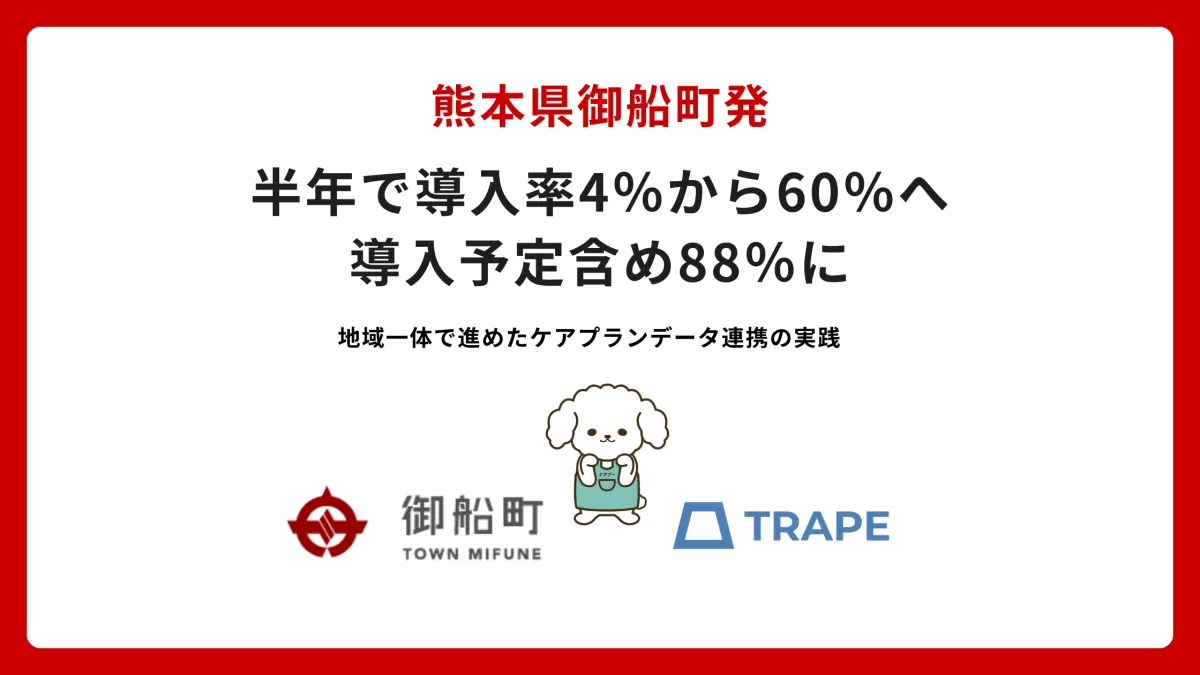 熊本県の御船町で、介護現場の効率化を目指したプロジェクトが進行中です。この取り組みは、株式会社TRAPEが主体となり、町内の介護事業所におけるケアプランデータ連携システムの導入を促進するものです。半年で導入率を4%から60%へ引き上げ、導入予定を含めると全体の88%に達するという成果を上げました。