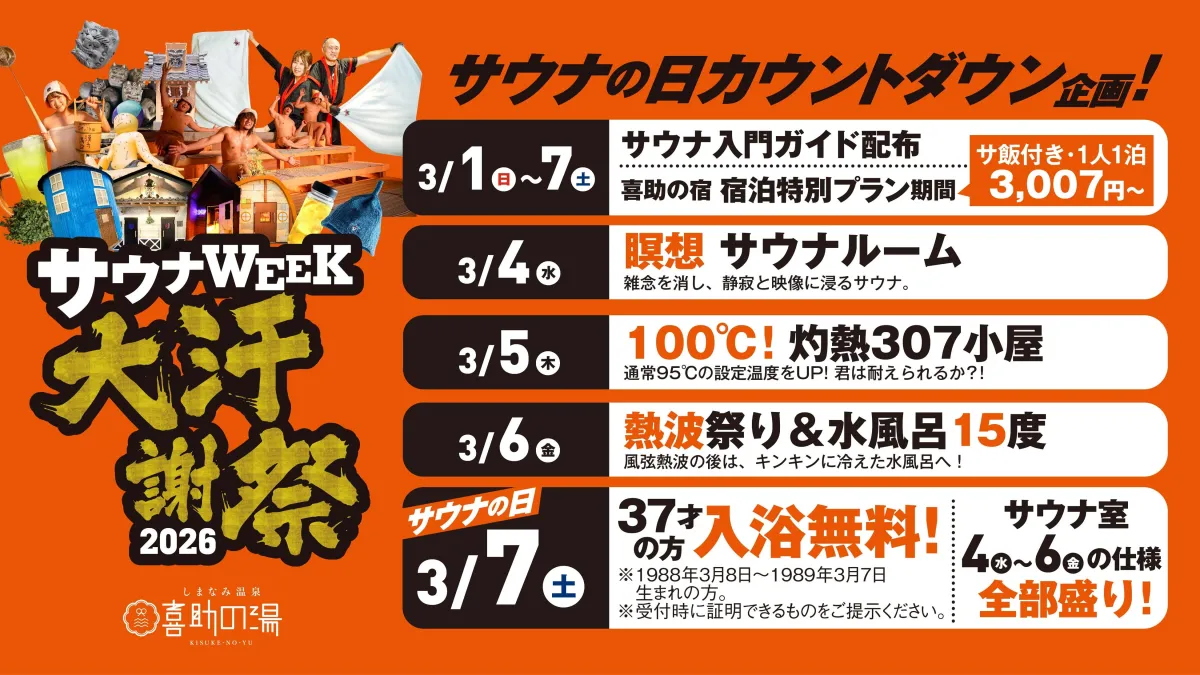 2026年3月7日、サウナの日を迎えるにあたり、愛媛県今治市の「しまなみ温泉 喜助の湯」では『大汗謝祭2026』が開催されます。イベントは3月1日から7日までの一週間にわたり、さまざまな特別体験が用意されています。この機会にサウナの魅力を再発見してみませんか?