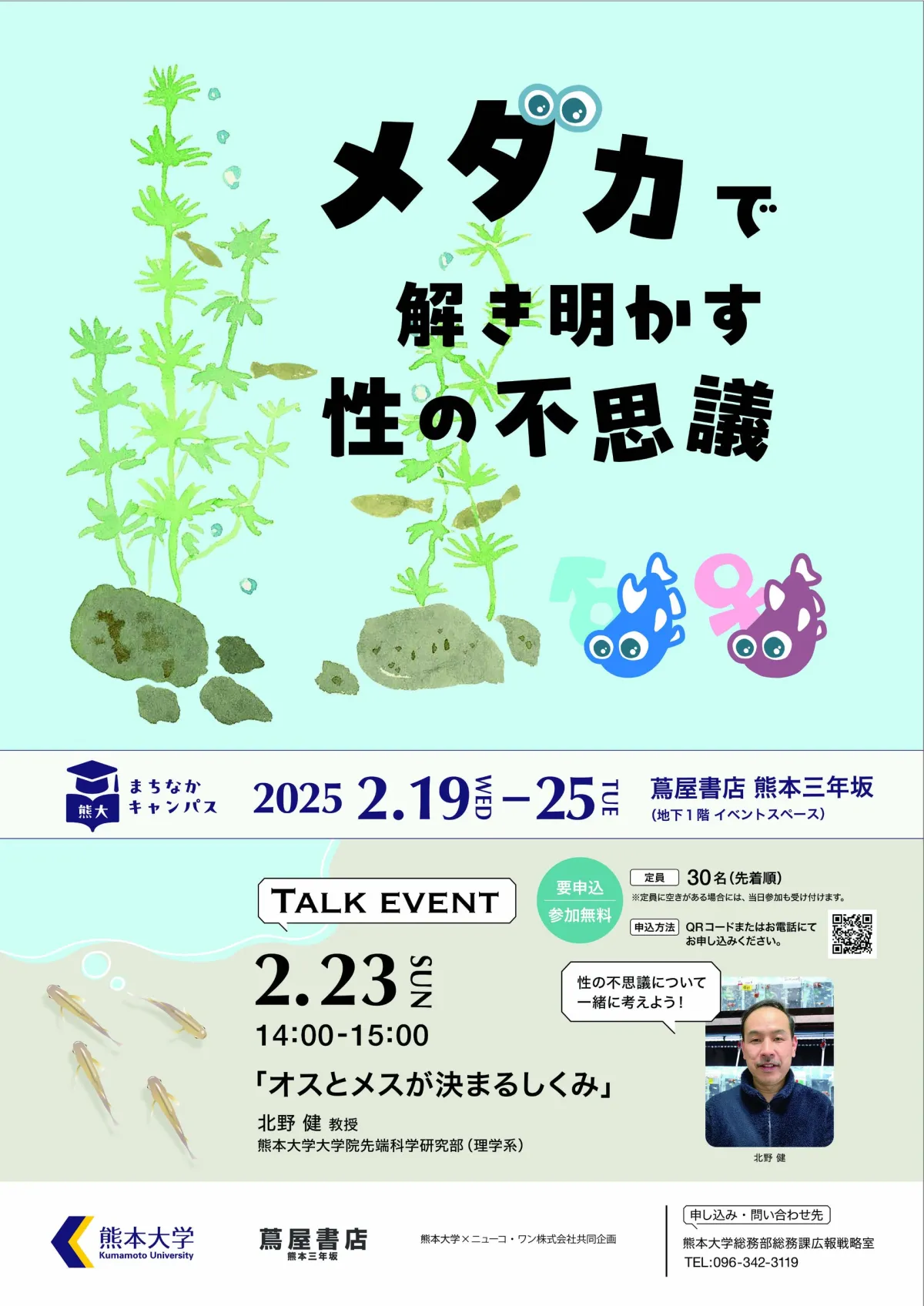 熊本大学とニューコ・ワン株式会社が共同で企画した特別展「メダカで解き明かす性の不思議」が、熊本市中央区の蔦屋書店熊本三年坂地下で開催されます。本企画は、動物生理学に特化した研究を行う熊本大学大学院先端科学研究部の北野健教授の研究成果を紹介することを目的としています。