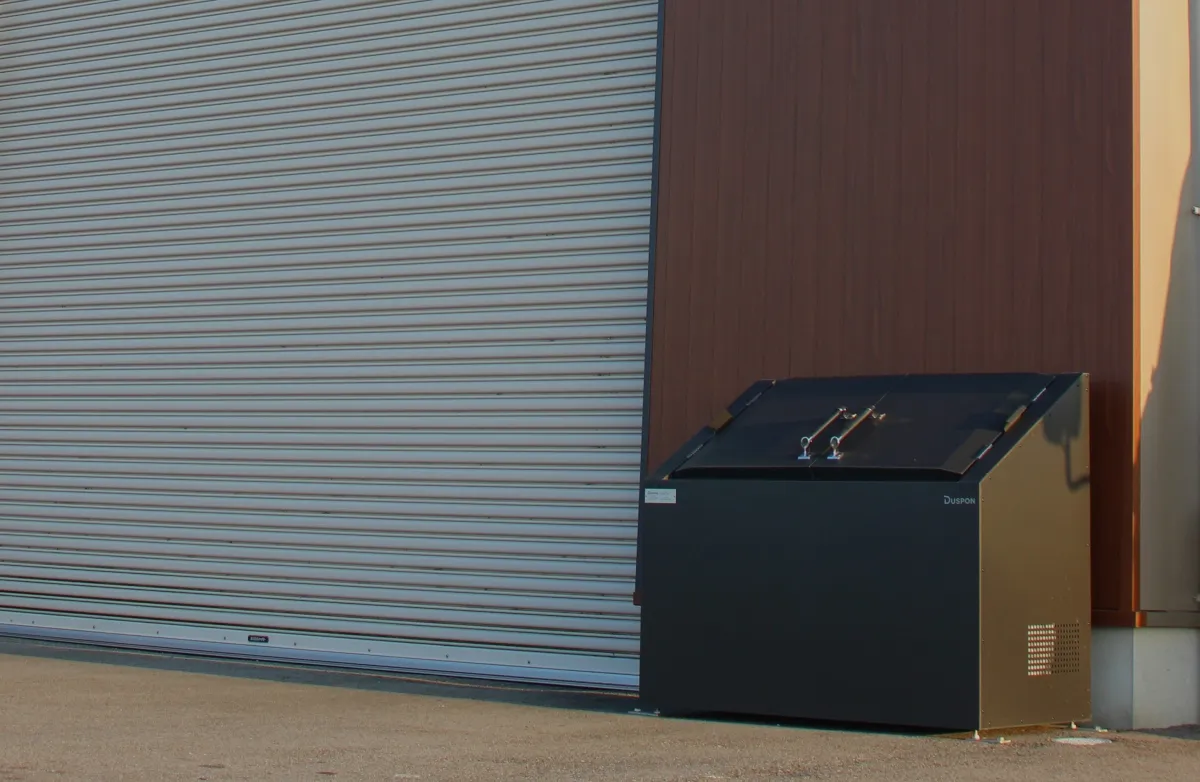 ダスポンのDSシリーズは、さまざまな利用者に適した収納能力を持ちながら、安全に利用できる設計が施されています。トルクヒンジによって、扉が一定の角度で止まるため、全開にした際や片手での操作も容易で、使い勝手が抜群です。奥村板金では、燃やせるごみと燃やせないごみを分けて収納しており、その580Lの大容量は、ゴミの出し忘れをしても安心な設計です。実際に奥村様からは、「ダスポンを導入してから、ゴミ出しがとても楽になった」との感想も寄せられました。