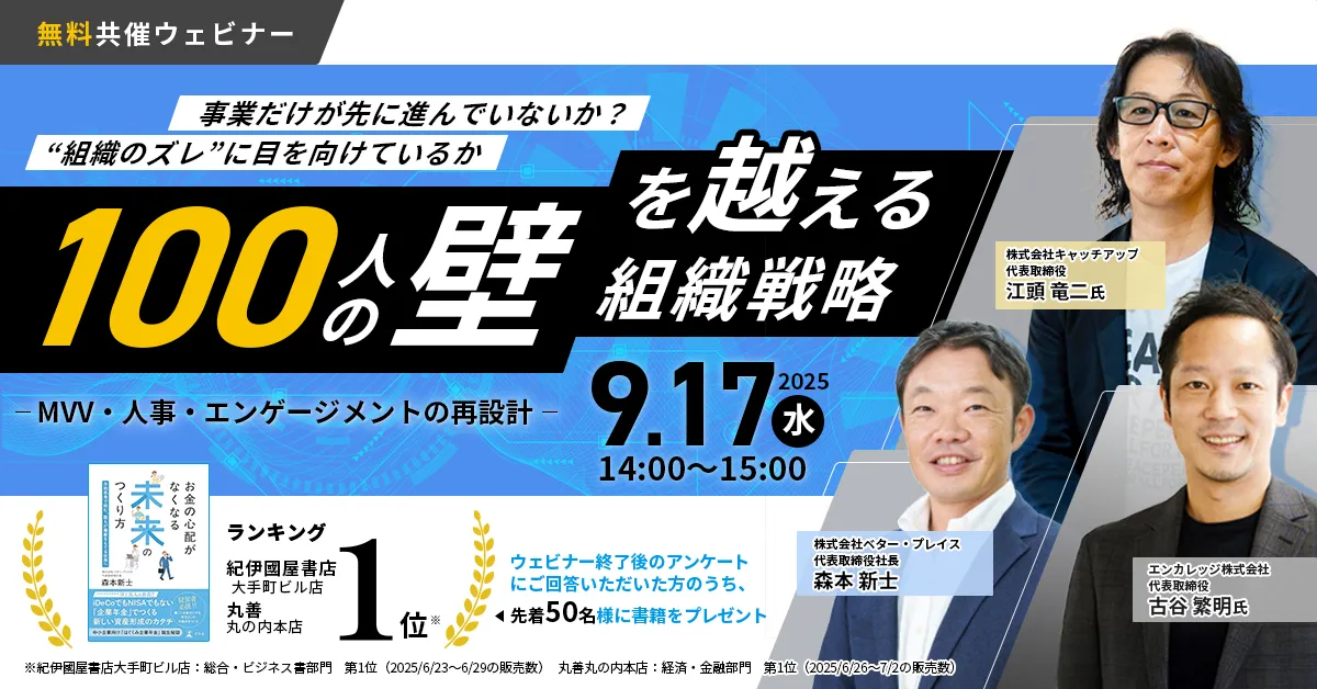 2025年9月17日(水)、株式会社ベター・プレイスは、エンカレッジ株式会社、株式会社キャッチアップと共催で、経営者向けオンラインセミナー「“100人の壁”を越える組織戦略~MVV・人事・エンゲージメントの再設計~」を開催します。このセミナーは、特に従業員が30〜100名規模の企業の経営者を対象としています。無料で参加できるこのイベントは、参加者がオンラインでアクセス可能なZoomプラットフォームを使用して行われます。