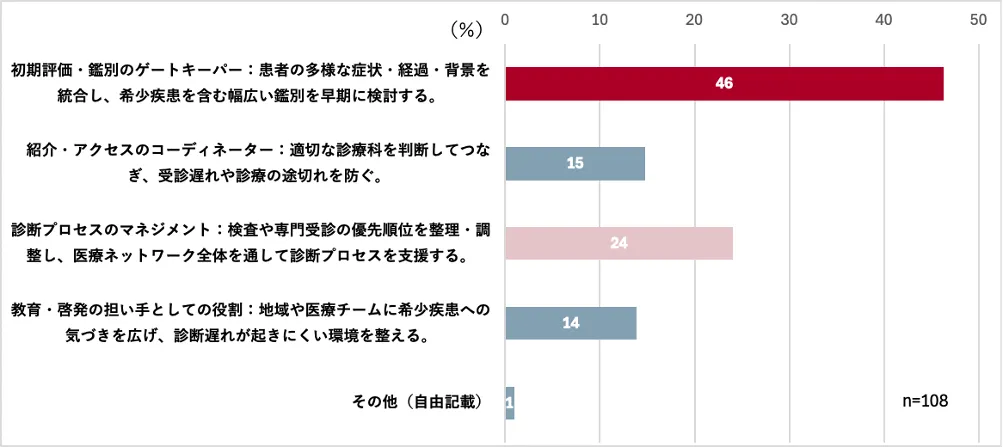 さらに、医師の46%が「初期評価・鑑別のゲートキーパー」としての役割を認識し、76%が希少疾患の早期発見に自ら貢献できると考えていることも明らかになりました。