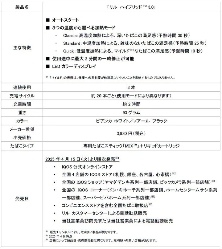 フィリップ モリス ジャパン(PMJ)は、2025年4月15日より新たな加熱式たばこ機器『lil HYBRID™ 3.0』の販売を開始することを発表しました。この新製品は、煙の出ない加熱式たばこであり、より快適な喫煙体験を提供することを目的としています。
