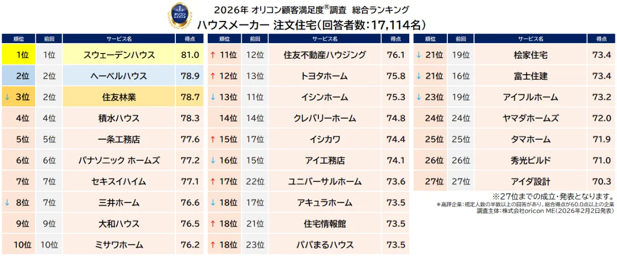 2026年2月2日、オリコン株式会社が実施した『ハウスメーカー 注文住宅』の顧客満足度調査において、スウェーデンハウスが12年連続で総合1位を獲得しました。この調査は、注文住宅を建築した17,114人を対象に行われ、実際の利用者からの生の声が反映されているため、非常に信頼性の高い結果となっています。
