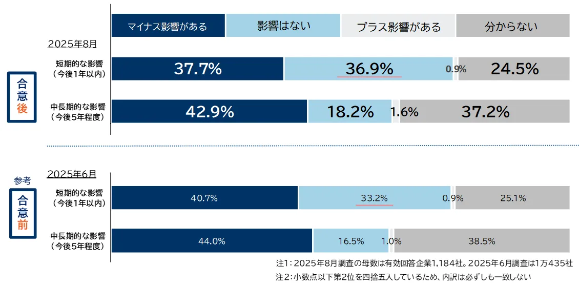 今回の調査結果から、トランプ関税の新たな合意内容は企業にとって複雑な状況を引き起こしています。短期的にはほとんど影響がないとする企業が多いものの、中長期的には「マイナス影響がある」との意見が増加しており、先行きに対する不安が強まっています。さらに、不透明な合意内容に対する評価も分かれており、今後の状況に影響を与える可能性があるため、企業は注意が必要です。