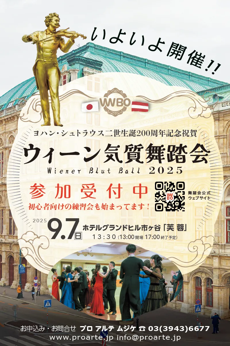 参加費はペアで35,000円、U25ペア(25歳以下の二人参加)は17,500円です。ダンスを楽しむだけでなく、ウィーンの文化を味わえるこの舞踏会は、ダンス愛好家や音楽に興味がある方にとっても、見逃せないイベントです。申し込みは、プロ アルテ ムジケに電話またはメールで行えます。興味のある方は、ぜひ公式サイトもご覧ください。 公式サイト: