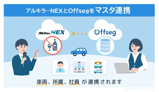 これまで、ユーザーが持つマスタ情報は、アルキラーNEXとOffsegの双方で個別に更新が必要でした。この手間を解消するために、Offseg側で情報を更新し連携ボタンを押すだけで、アルキラーNEX側の「車両」「所属」「社員」のマスタ情報が一括で同期される仕組みが導入されます。この機能によって、重複した入力作業を排除し、管理業務の効率性とデータ整合性が向上します。