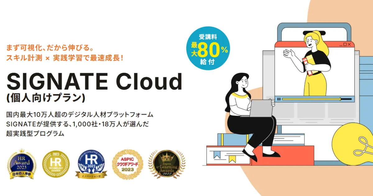 SIGNATE Cloudのいくつかのプログラムは、経済産業省から認定を受け、半年あたり最大80%の受講費用補助を受けられる教育訓練給付金の対象となっています。これにより、より多くの方々が手軽にスキルアップを目指すことが可能になりました。