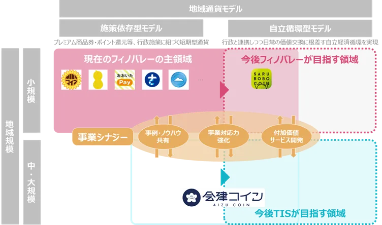 TISが手がける「会津コイン」の事例や脱炭素化に向けた取り組みにおいて、フィノバレーの地域振興施策のノウハウを活かし、両社でのデジタル地域通貨事業の持続性向上を図る。