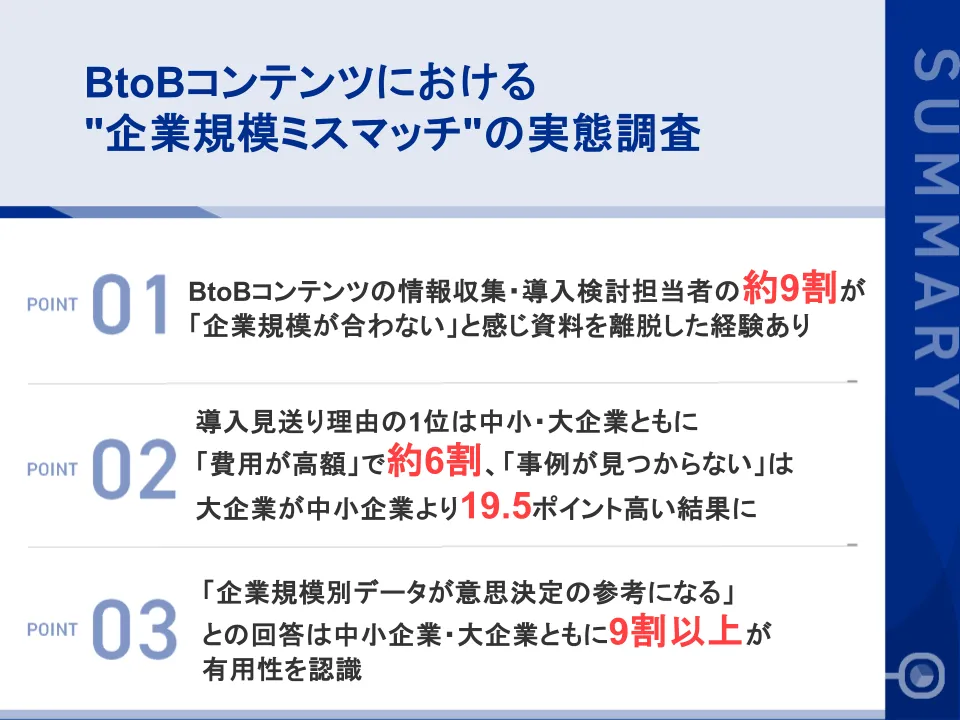 この調査から、BtoBコンテンツにおける企業規模のミスマッチが、資料の途中離脱や導入見送りに大きな影響を与えていることが確認されました。企業規模に応じたコンテンツ設計の重要性がさらに明らかとなり、BtoBマーケティングの成果向上には欠かせない要素となるでしょう。