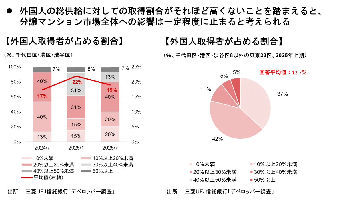 また、外国人によるマンションの取得についても言及されています。市場全体に占める外国人購入者の割合は、一定の水準でとどまっており、新たな需要を生むに至っていない状況です。このような中で、今後の市場がどのように動いていくのか、さらなる分析が求められます。