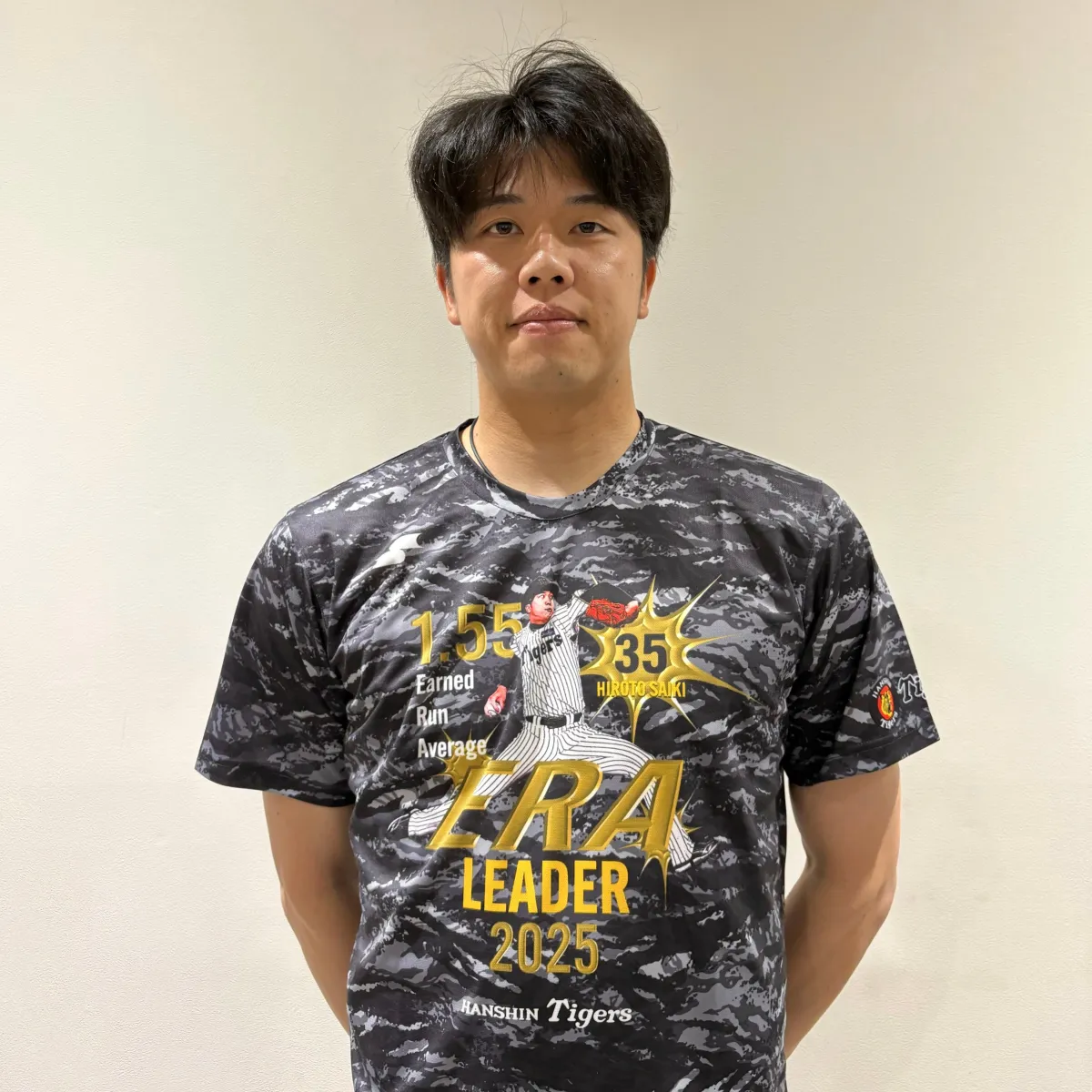 本記念Tシャツは、阪神タイガースをイメージしたダークトーンの迷彩柄でデザインされています。胸元には「ERA LEADER 2025」のゴールドロゴが配置され、成功を称える記念の一品となっています。さらに、中央には才木選手の投球シーンが描かれており、左袖には阪神タイガースのロゴが入っています。背面には背番号「35」と選手名がプリントされており、シーズンの感動と努力をいつでも感じられるようになっています。観戦時には、ファッションアイテムとしても魅力的です。